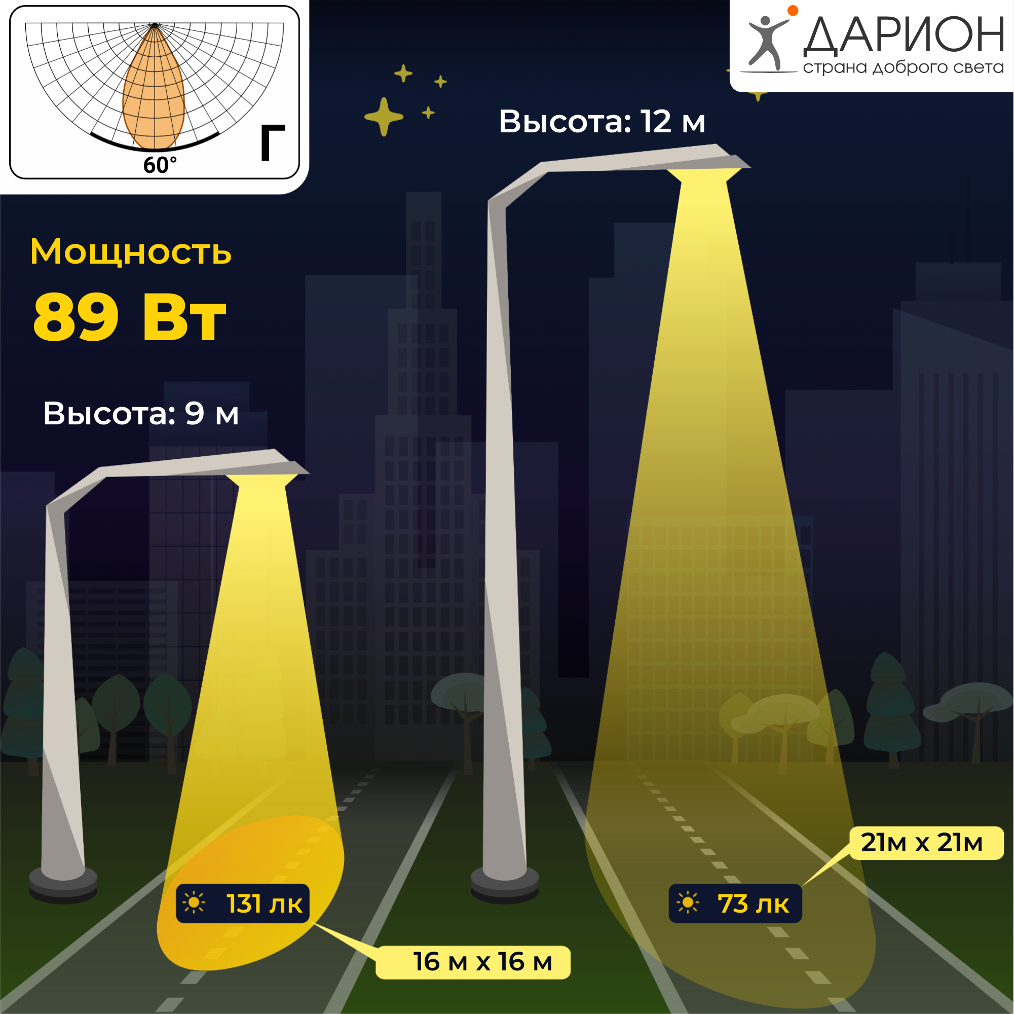 Светодиодный прожектор VRN-LPE60-89-A50K67-U с универсальным креплением. Какую задачу решает светильник? Если вам нужно осветить площадь на некотором расстоянии от светильника. Например: 🟢 детскую площадку за прудом, или 🟢 зону вратаря с опоры в центре поля, или 🟢 парковочное место в 15-ти метрах от светильника на крыше, или 🟢 другую площадь где нельзя поставить светильник рядом. В таких случаях с задачей справится светильник с направленным световым потоком, например светодиодный светильник VRN-LPE60-89-A50K67-U. Что значит направлять свет? Свет не распространяется во все стороны равномерно, а сосредоточен на небольшой площади. Т.е. исходит от светильника под более узким углом. Как автомобильная фара - не светит в стекло встречной машины, не освещает поля и леса за обочиной, а светит точно на полосу движения, по которой следует машина. LED светильник VRN-LPE60-89-A50K67-U имеет угол рассеивания 60 градусов. Таким образом весь световой поток направлен к объекту куда прицелен светильник. Такая направленность света называется КСС (кривая силы света), 60 градусов принято называть КСС - “Г” глубокая. В чём преимущества перед другими светильниками? Если сравнить с обычными светильники или прожекторами, которые чаще всего имеют угол рассеивания 120 градусов. Многие пользователи ставят мощные прожекторы чтобы осветить площадь или объект, который находится вдали, но получают большое количество паразитного света, т.е. освещают дома соседей, лес, лужайки вокруг, но нужная площадь остается освещенной недостаточно. Такой подход к освещению в целом не плохой, но есть некоторые минусы: ❌паразитный свет может мешать окружающим, ❌ приходится ставить мощные светильники или увеличивать их кол-во, т.е. ❌ сильно увеличиваются расходы на электроэнергию, ❌ обслуживание, ремонт и замена таких светильников наверняка обойдется дороже. Если применять светодиодный светильник VRN-LPE60-89-A50K67-U, с углом рассеивания 60 градусов, то мы 🟢 сосредоточим весь свет на нужной площади, 🟢 паразитный свет не будет беспокоить соседей или освещать лес или траву за забором, 🟢 сэкономим на электроэнергии, т.к. будет достаточно прожектора в 2-5 раз меньшей мощности. Размеры пятна света и расстояние от LED прожектора VRN-LPE60-89-A50K67-U до освещаемой площадки или объекта вы можете найти в изображениях инфографики. Или обратитесь к нам за расчетом освещенности, мы быстро и с удовольствием вам поможем. Почему светильник дороже чем аналогичные? Оптика. Для производства светильника с направленным светом используются специальные линзы. У LED светильника VRN-LPE60-89-A50K67-U такая линза установлена на каждый светодиод. А материал линзованного рассеивателя качественный акрила (ПММА). Материал который 🟢 очень трудно повредить или разбить, 🟢 он не желтеет со временем, 🟢 не рассыхается, 🟢 выдерживает температурные разницы от -60 до +50 ℃. Такая технология производства несколько дороже чем у большинства светильников, где светодиоды закрыты обычным силикатным стеклом или недорогим полимерным материалом, который: ❌ хрупкий, ❌ со временем может менять форму, ❌ может темнеть. Блок питания. Для производства светодиодных прожекторов VRN-LPE60-89-A50K67-U производитель использует качественный блок питания, который 🟢 не выйдет из строя при высоком скачке напряжения, 🟢 а светильник будет стабильно работать при низком напряжении в элект