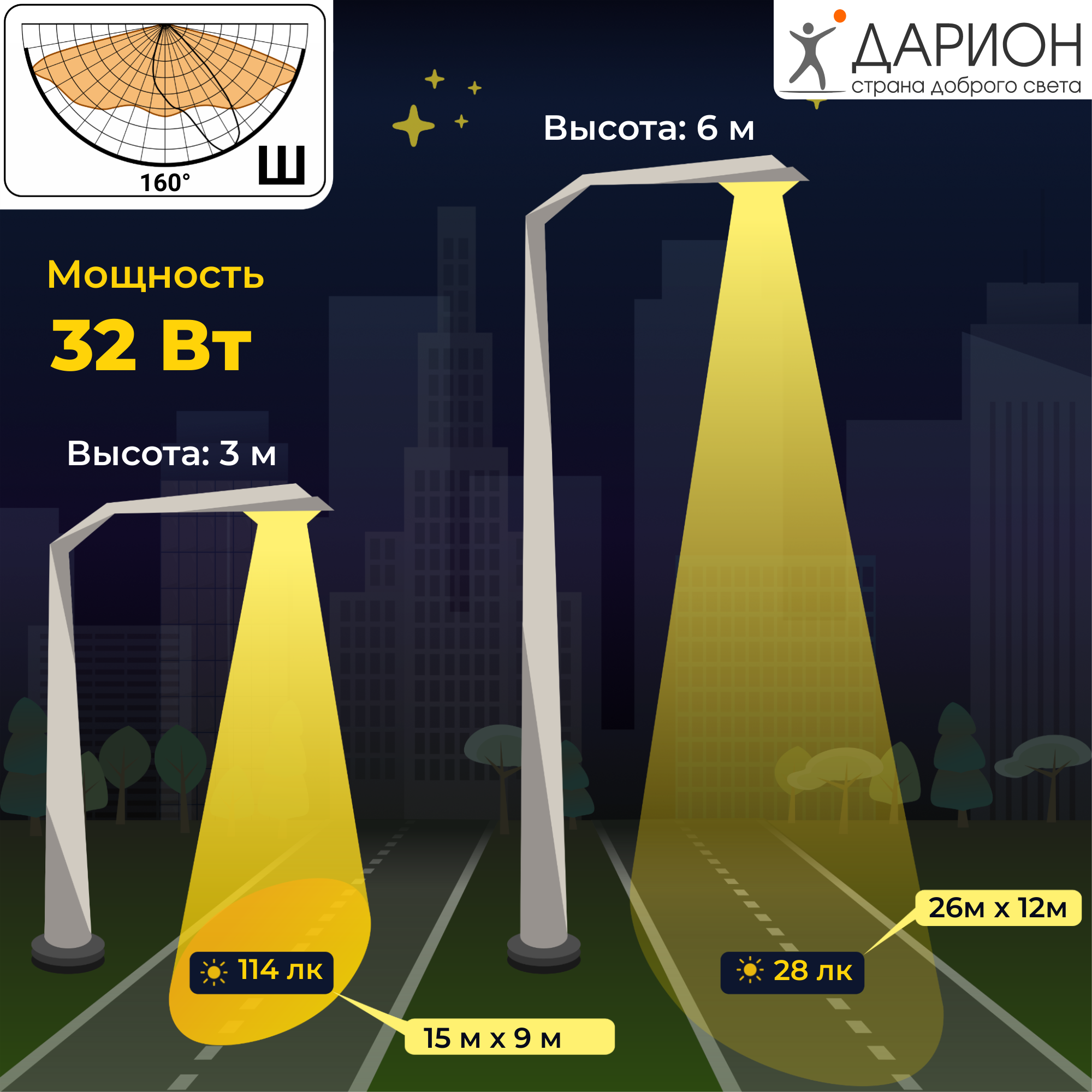 🟢 широкое распределение светового потока (130°-170°) обеспечивает равномерную засветку дорожного полотна без «слепых зон»;