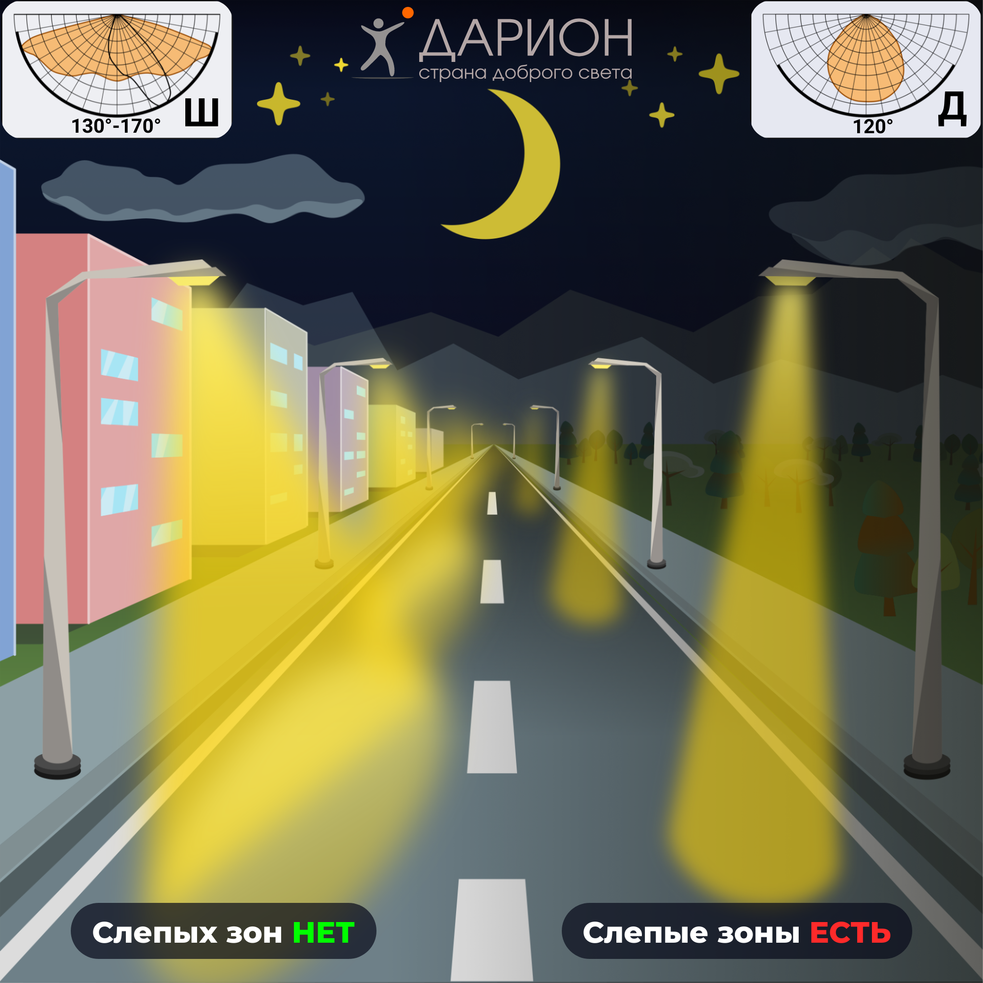 🟢 широкое распределение светового потока (130°-170°) обеспечивает равномерную засветку дорожного полотна без «слепых зон»;